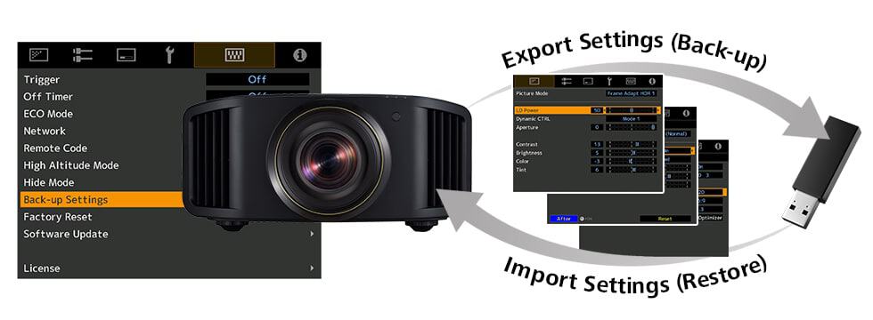 This function saves the settings on the main unit menu to a commercially available USB flash drive. Professional adjustments can be saved or backed up in advance to undo unintended adjustments by children or family members.